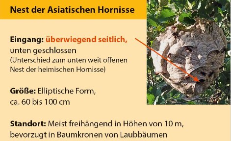 Bitte melden Sie Sichtungen von Asiatischen Hornissen (Erforderliche Angaben: Name, Adresse, Telefonnummer, Standort des Nestes, Foto) an die